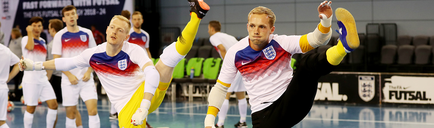 Futsal goalkeeping coach education lead, Tony Elliott, puts on an activation session for two England goalkeepers to develop their agility, balance and coordination skills.
