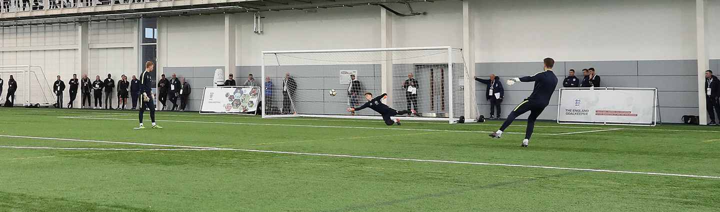 Marco Knoop, Borussia Dortmund goalkeeper coach, delivers a decision-making practice with young goalkeepers at St. George’s Park.