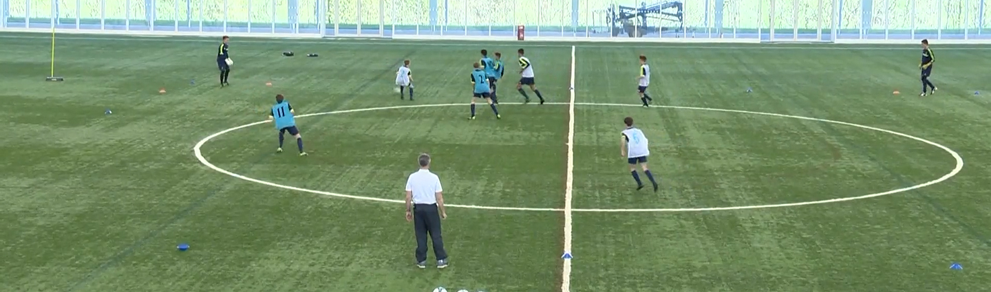 FA coach educator, Eric Steele, delivers a goalkeeper practice with academy players focusing on integrating the goalkeeper with outfield players.