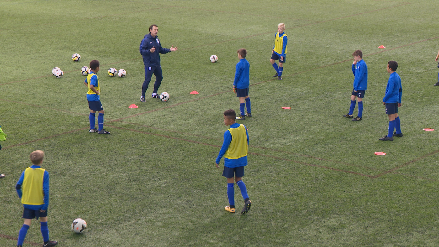 FA youth coach educator, Geraint Twose, delivers an in possession session focusing on forward passing with a group of U11 academy players.