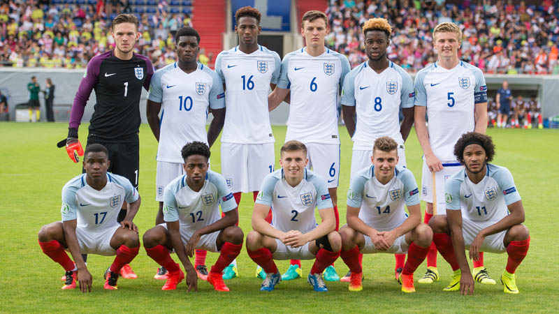 England Under-19s: 1 Freddie Woodman (Newcastle United); 5 Taylor Moore (RC Lens), 6 Dael Fry (Middlesbrough), 14 Reece Oxford (West Ham United), 2 Jonjoe Kenny (Everton); 12 Kyle Walker-Peters (Tottenham Hotspur), 8 Josh Onomah (Tottenham Hotspur), 14 Ryan Ledson (Everton); 10 Sheyi Ojo (Liverpool), 17 Ademola Lookman (Charlton Athletic), 11 Izzy Brown (Chelsea).