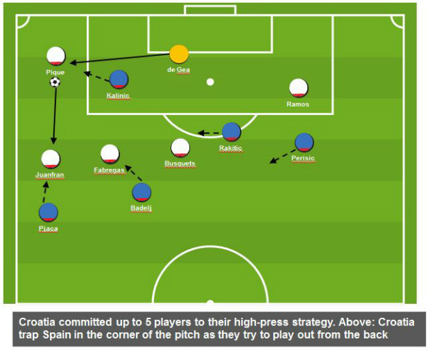 There was, however, risk involved. When Croatia failed in engaging the man on the ball and left passing lines open, Spain were invited to demonstrate their composure, movement and technical excellence to cut through the press. Moments after their impressive opening, Croatia could only watch as del Bosque’s side scored following an effortlessly flowing, highly-technical move